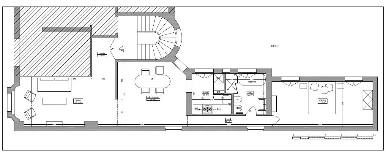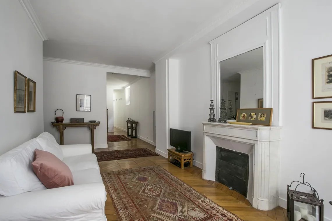 Il se compose d’une entrée donnant sur un salon avec bow window coté rue, et côté cour une salle à manger, une grande chambre avec penderie, et une salle de bains avec toilettes.